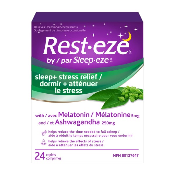 Rest Eze by the makers of Sleep Eze provides sleep and stress relief. Formulated with Melatonin (5mg) and Ashwagandha (250mg), Rest Eze helps reduce the time to fall asleep and helps relieve the effects of stress. These caplets help you fall asleep faster and ready for the next day, without next day grogginess. Rest Eze helps you fall asleep and stay asleep for a higher quality sleep cycle. It's also made in Canada with domestic and imported materials.