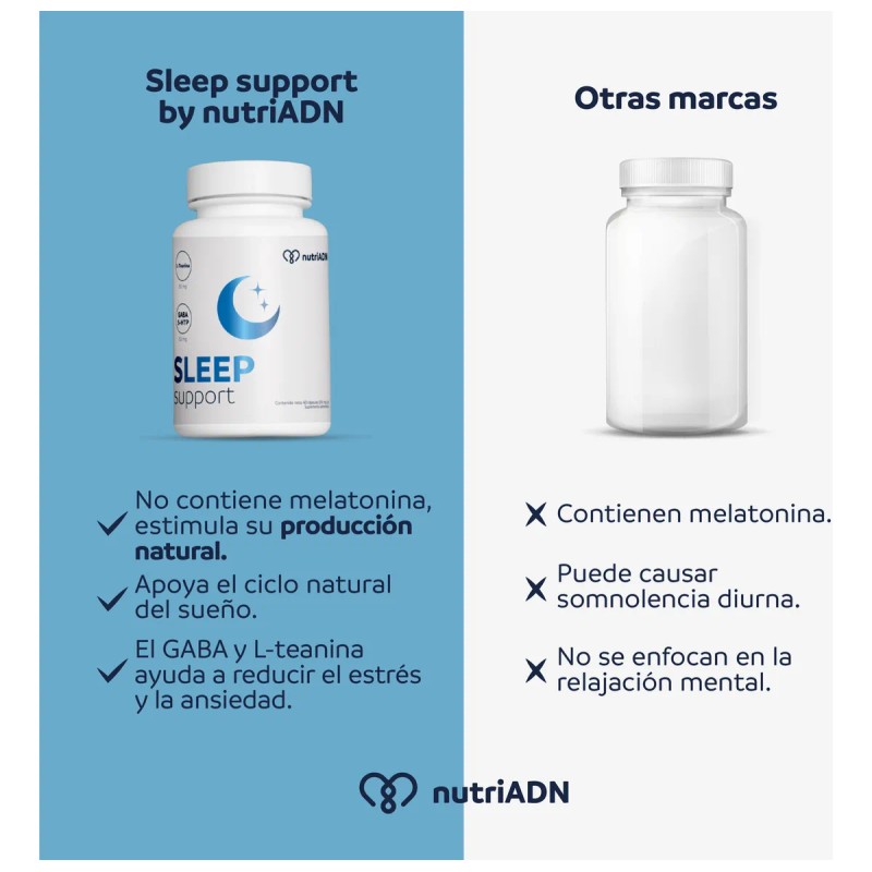 ## Beneficios Clave de Sleep Support By Nutriadn 😴: * Duerme más rápido y naturalmente 🌿. * Relajación profunda para un descanso reparador ✨. * Apto para veganos y sin lactosa 🌱. * Fácil de tomar con cápsulas convenientes 💊. * Mejora tu calidad de sueño 📈.