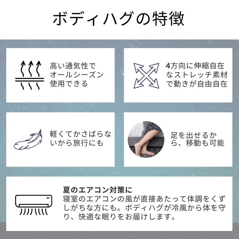- NEW SLEEP SOLUTION: From Sleep Vantage, the industry first! Introducing the BodyHug (Body Hug) that wraps your entire body for a good night's sleep. By applying gentle pressure on the entire body, it feels like a gentle hug and heals both your body and mind. The cocoon-like shape hugs your entire body to help you fall asleep