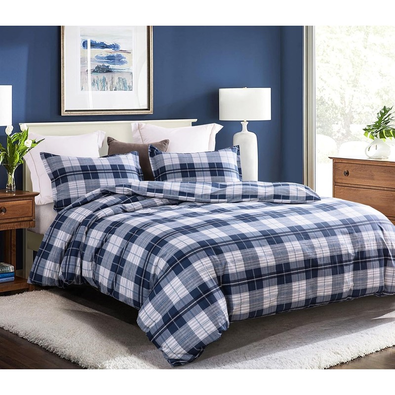SLEEPBELLA Cotton Queen Size Comforter, 600 Thread Count Cotton Navy Blue & Grey Buffalo Pattern Blue Plaid Comforter Sets,Down Alternative Bedding Set 3Pcs (Queen, Navy Plaid)