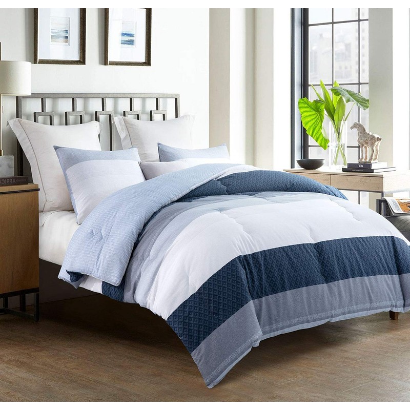 SLEEPBELLA Queen Comforter Set, White and Navy Striped Patchwork Reversible Pattern, Cotton Fabric with Soft Microfiber Fill Duvet Sets, 3pc Down Alternative Bedding Set