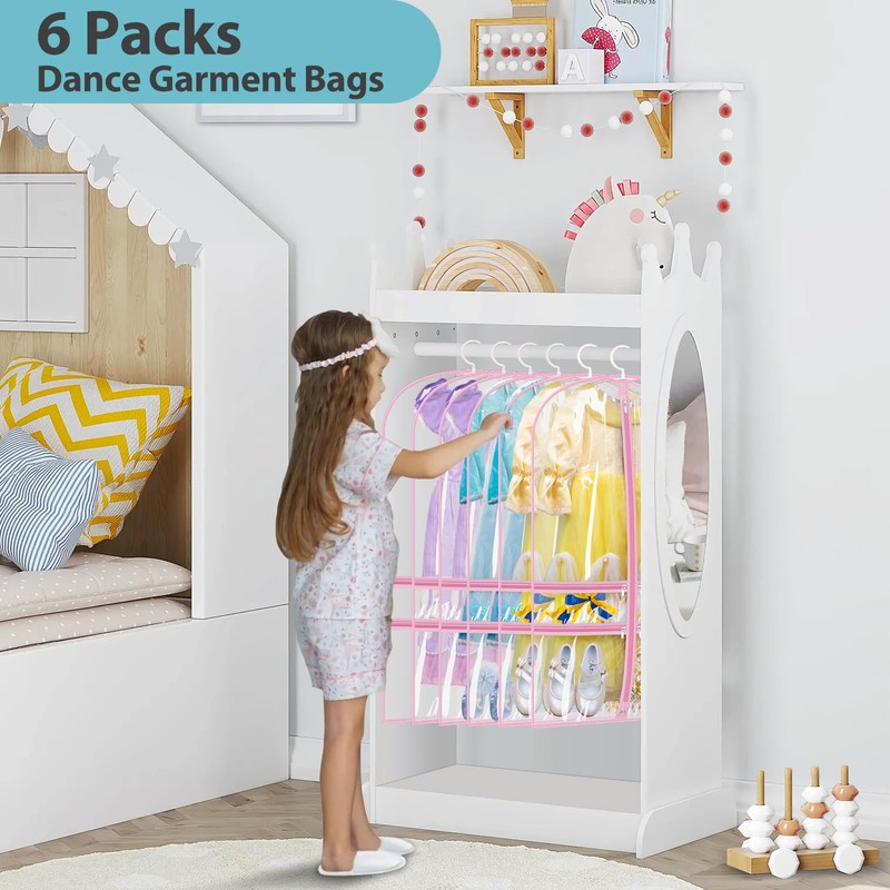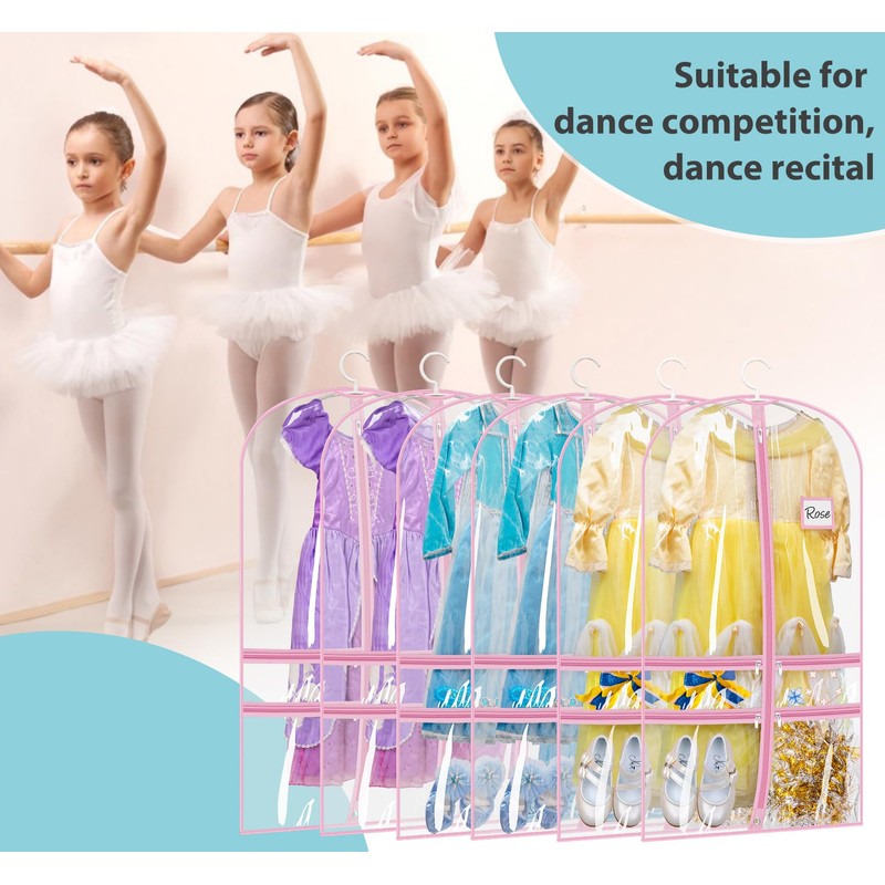SLEEPING LAMB 6 Packs Clear Garment Bags for Dancers With 4 Pockets, 40" Kids Costume Bag for Travel and Dance Competition, Hanging Clothes Storage for Dress, Uniform, Pink