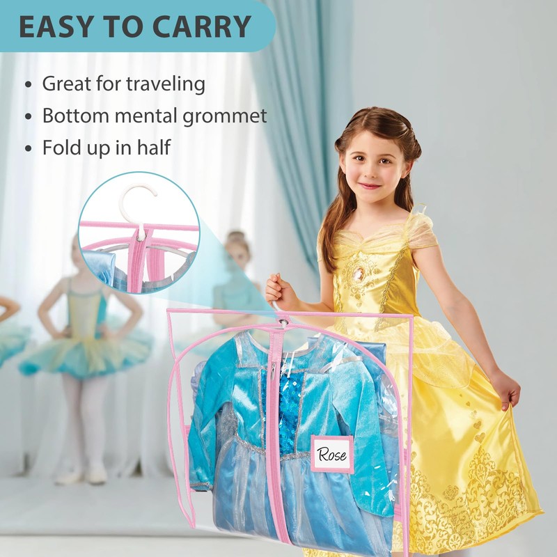 - 【Everything in 1 Bag】The 4 zippered pockets of the kids costume storage keep all accessories visible and organized. Cheer uniform garment bag are great for dance shoes, hair pieces, jewelry, socks etc, so you won’t forget anything; Name tag pocket is also sewed on the bag, so don't worry about dress mix up during group performance;
