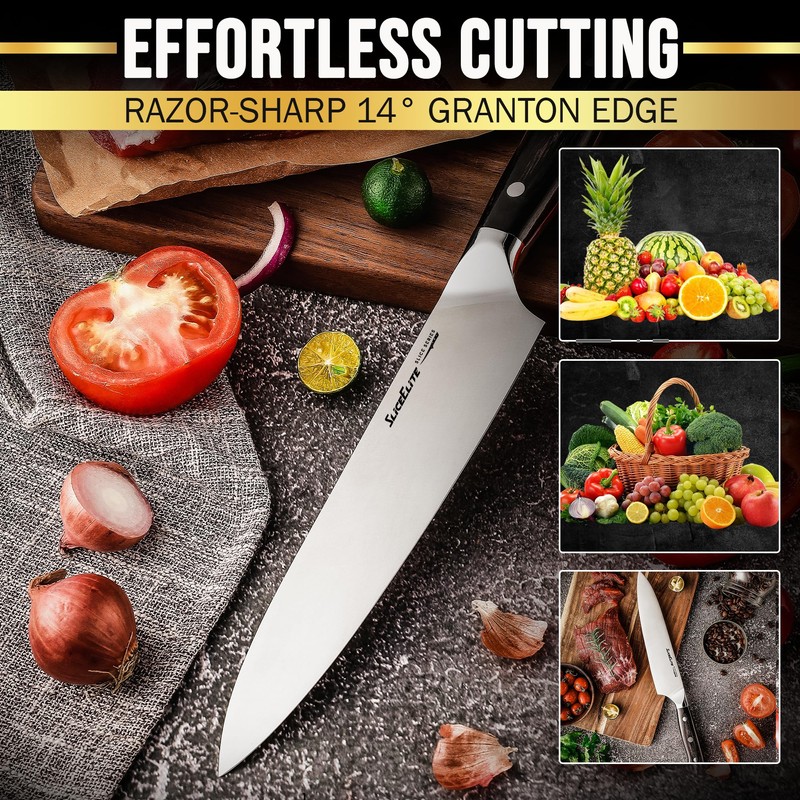 - ✅ PREMIUM HIGH CARBON GERMAN STEEL – Forged from 1.4116 high carbon German steel, this chef knife offers razor-sharp precision, durability, and exceptional edge retention for professional-grade performance.