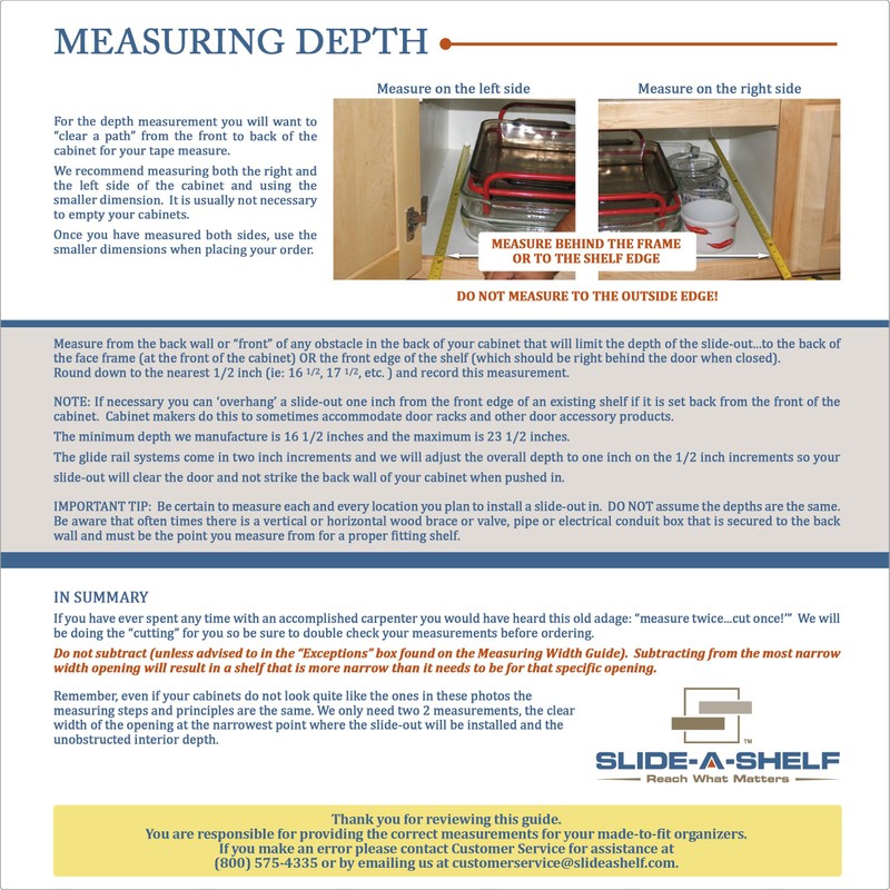 - MEASURE | ORDER | INSTALL | REACH WHAT MATTERS: Finding the right fit is easy! Just measure the clear-width opening of your cabinet (this includes any hinges, door protrusions or any other obstructions) and round down to the next nearest available width. Follow these same guidelines for your depth and you're done!