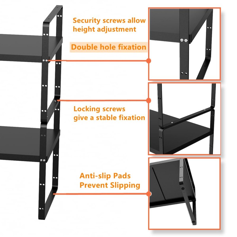 - Please read instruction before installation. The stackable counter shelf organizer is easy to assemble with only 8 screws. It should take less than 5 minutes to assemble.