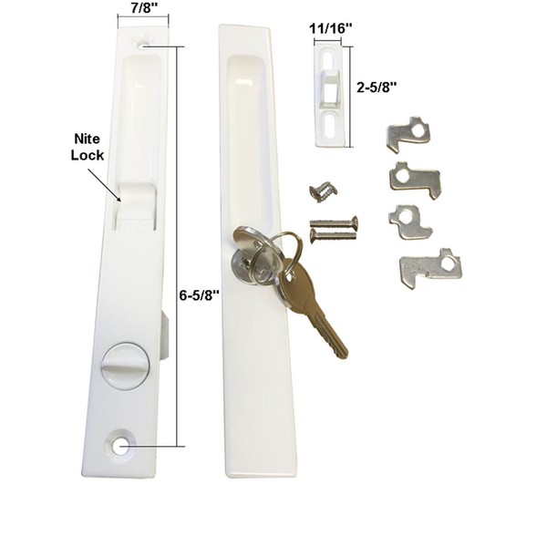 Sliding Glass Door Handle Set, Keyed, Flush Mount, with"Nite-Lock" and Five Hook Assortment, White, 6-5/8" Screw Holes