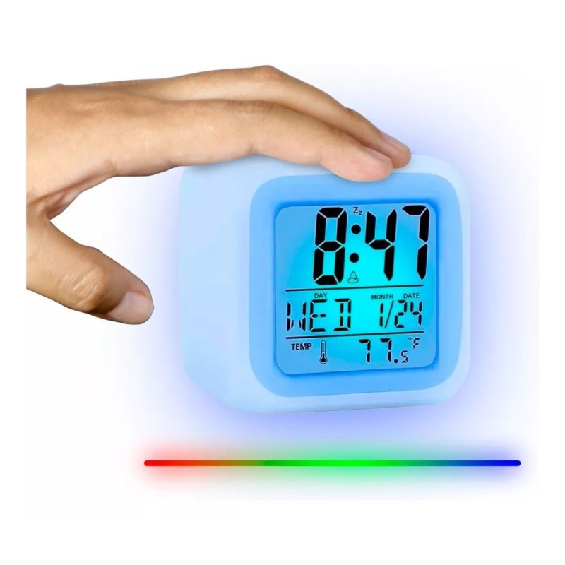 Reloj Despertador Digital de Cubo con Luz Led Multicolor de 7 Tonalidades, Termómetro y Calendario Mes Año Día.