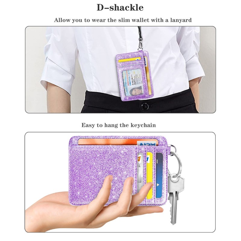 Slim Front Pocket Wallet RFID ID Card Holder Cute Small Wallet with Keychian for Women, Glitter Purple, Slim