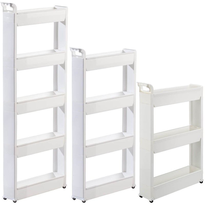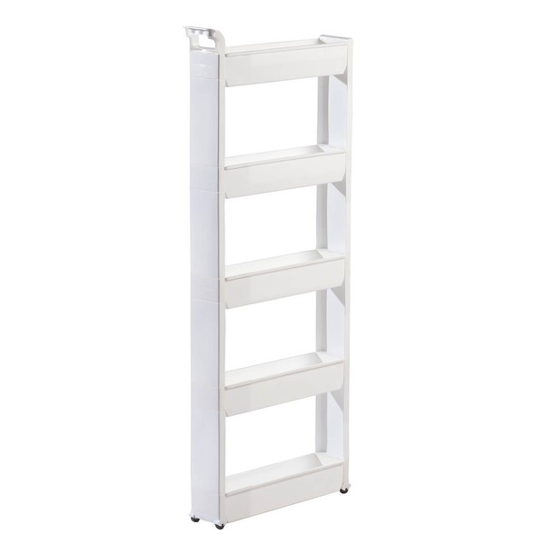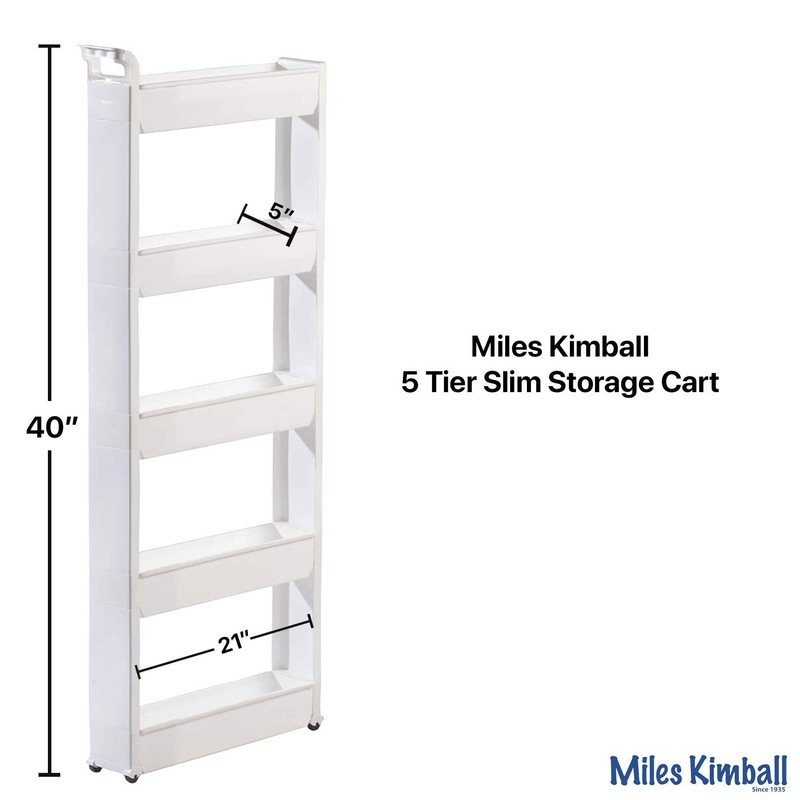 Turning tight spots into generous storage space, this slim storage cart is surprisingly spacious with 5 shelvesrolling in and out for quick, easy access. Perfect for the kitchen, this storage cart fits into that unused space between appliances and cabinets, and is just as handy in the laundry room, bathroom, bedroom, garage or any room. Five shelves suit your storage needs; each holds up to 6.5 lbs., and raised sides keep contents secure. Smoothrolling casters glide easily on any surface without marring; convenient handle makes it easy to push back and forth. All durable plastic pieces of this rolling cart snap together for easy assembly; no tools required. 21" long x 5" wide x 52" high.
