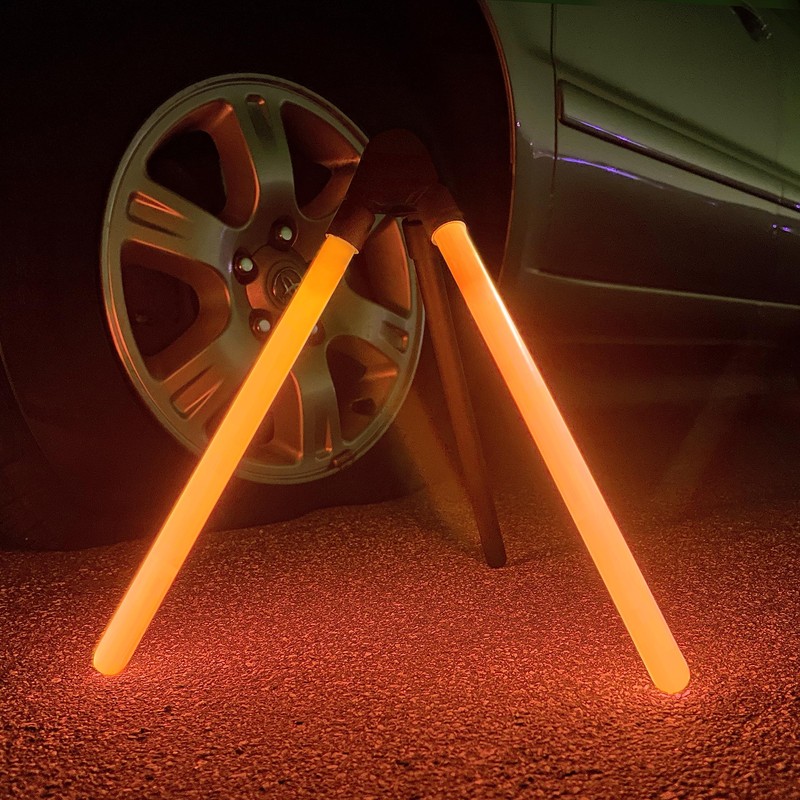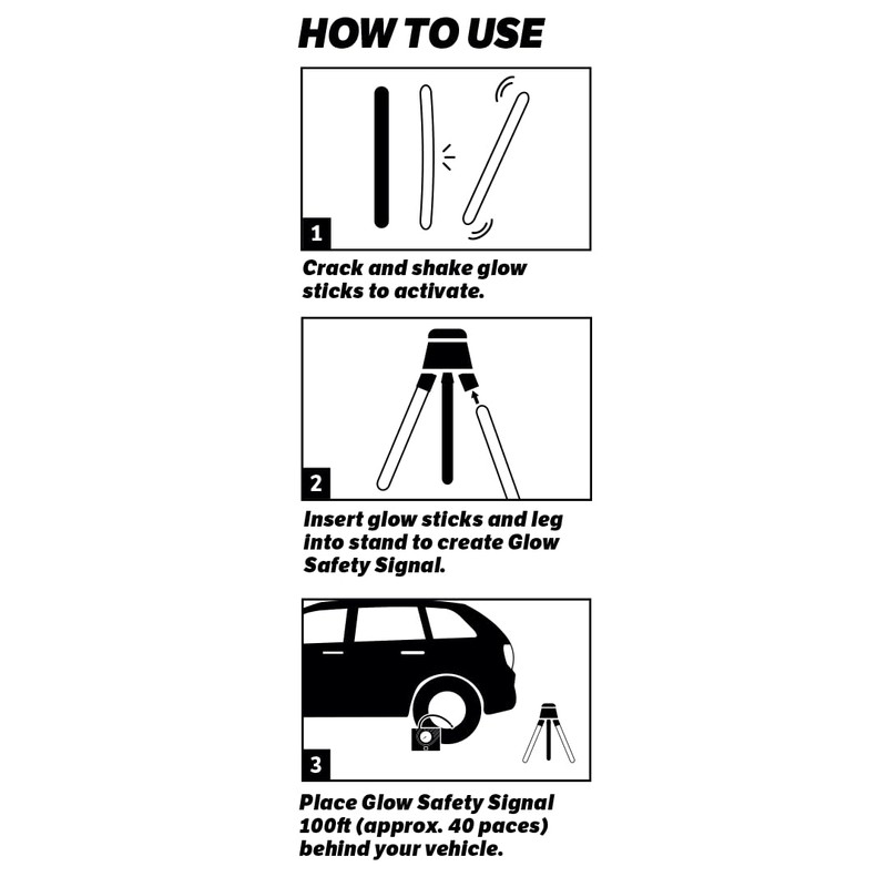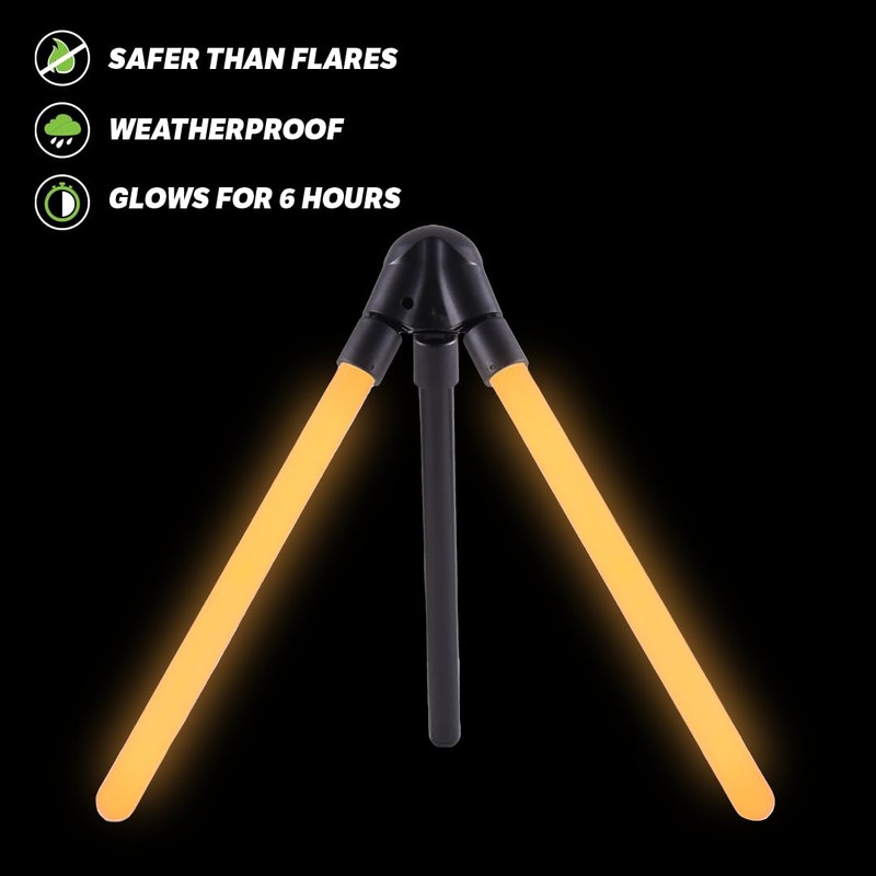 • Simply activate the two glow sticks, place them in the signal tripod and quickly illuminate your surrounding area