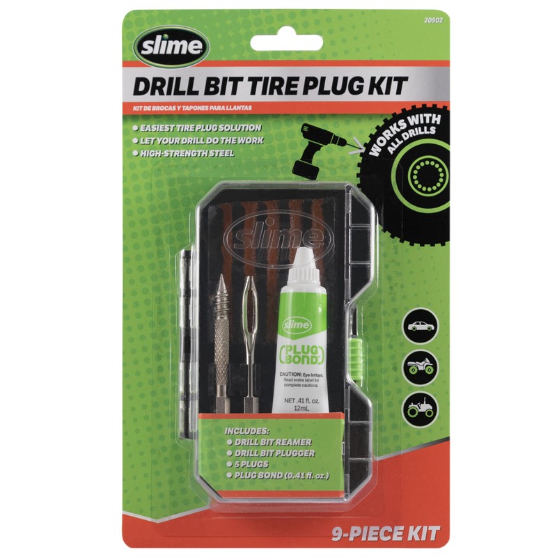 - Let your drill do all the work! Slime's Drill Bit Tire Plug Kit is the easiest tire plug solution on the market. With high-strength reamer and plugger bits that work with all drills, durable tire plugs and Plug Bond, this 9-piece set eliminates all the physical effort (i.e. hard labor!) previously required to plug a tire.