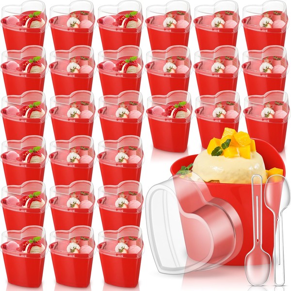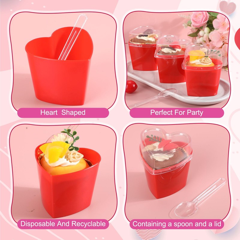 - Heart Shaped Design: these red dessert cups with lids feature a heart shaped design, with bright colors that look cute and nice for Valentine's Day gatherings to add a romantic atmosphere; They can hold Valentine's Day gifts such as pudding, cake, and candy