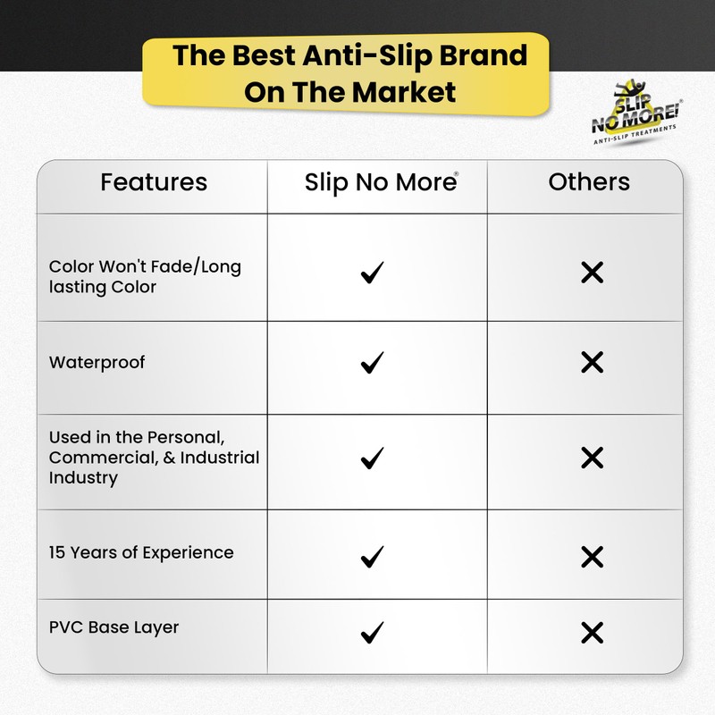 - 𝐎𝐯𝐞𝐫 𝟏𝟓 𝐘𝐞𝐚𝐫𝐬 𝐨𝐟 𝐏𝐫𝐨𝐯𝐢𝐝𝐢𝐧𝐠 𝐀𝐧𝐭𝐢-𝐒𝐥𝐢𝐩 𝐒𝐨𝐥𝐮𝐭𝐢𝐨𝐧𝐬: Slip No More is known for its anti-slip solutions and non slip stair treads. With over 15 years of experience in the field, our gripe tape anti slip products have been designed to solve the issue of slippery floors at home, the workplace, commercial areas, industrial buildings, & more. Our anti-slip tape, glow in the dark tape, anti slip stair strips, treatments, and coatings will help provide you and your loved ones with a safe non-slippery environment!