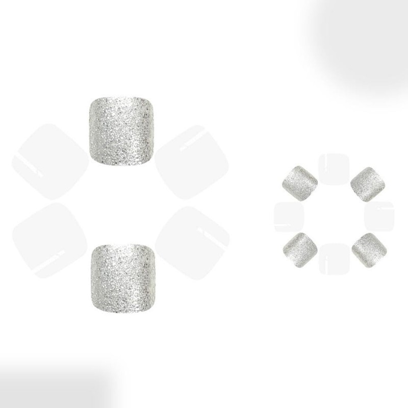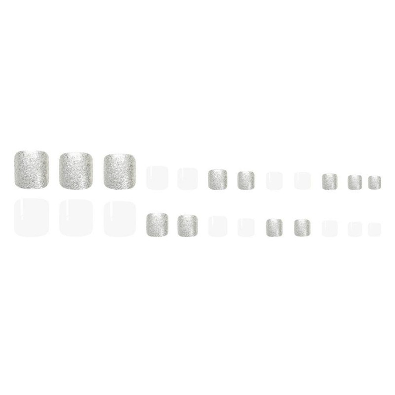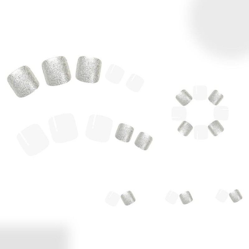 - Package Contents:24Pcs shiny fake toe nails +1 Nail File + 24Pcs Jelly Glue Stickers+1 Wooden Stick. No matter the size or width of your nails, you can choose the most suitable white glue on toenails for yourself. These toenails are suitable for wide toenails