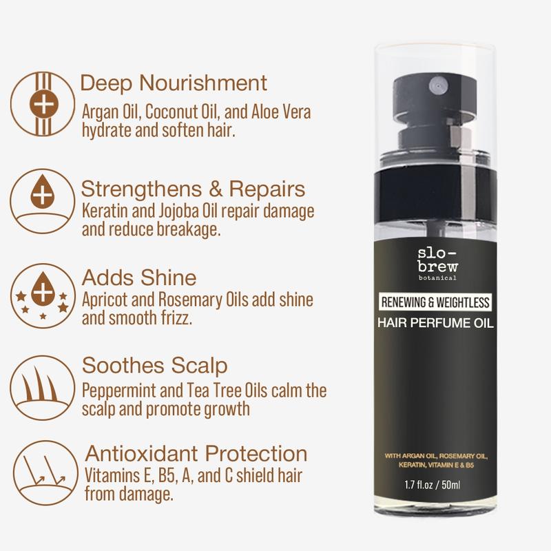 Refresh and revitalize your hair with SLO-BREW Hair Perfume Spray, a lightweight formula that blends long-lasting fragrance with nourishing care.