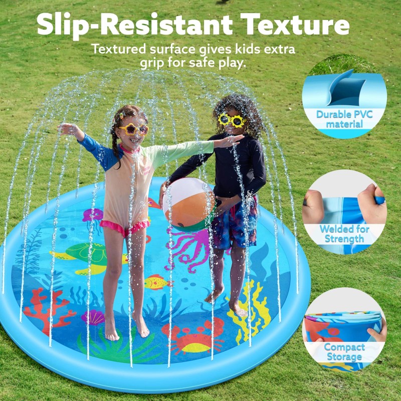 Slip-Resistant Design: The splash pad features a non-slip texture to help prevent falls, keeping kids and pets safe while they play. This summer toy creates oceans of adventures kids toys ! so your little squirt soaks up some knowledge during play!