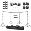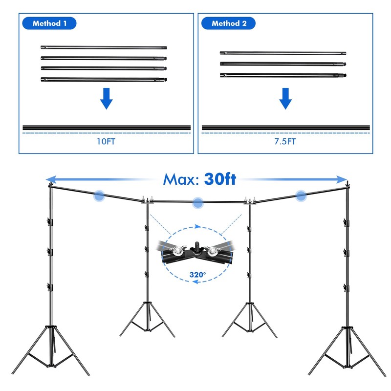 - Package Includes: 3 x Heavy Duty Telescopic Crossbars: 12pcs-Interlocking Bars (30 FT) / 4 x Heavy Duty Light Stands (10 FT), / 2 x 300° Angle Adjustable Crossbar Connector / 12 x heavy duty spring clamps/ 4 x Sand Bags/1 x Carry Bag