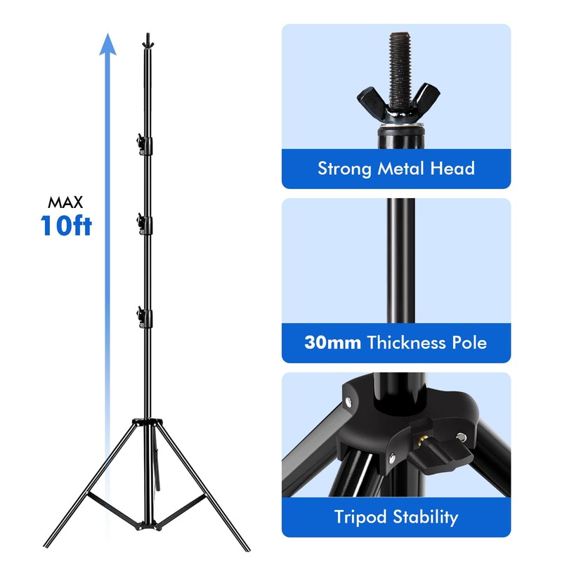 - (2)x Heavy Duty Light Stands (10 FT) The heavy duty light stand can be adjusted in height from 3.2ft to 10ft ,they are Strong & durable & stability pole backdrop stand. Max Load Capacity 40 LB(2)x Heavy Duty Light Stand with Universal Head, it is middle stand. It can be connected with crossbar to be right angle and horizontal Building Modes.