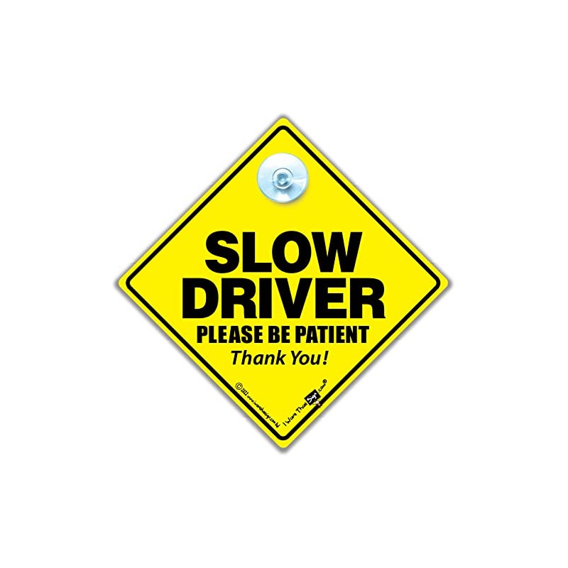 Slow Driver Please Be Patient Car Sign For New Drivers or Nervous Drivers or Elderly Drivers, Suction Cup Advisory Car Sign For Safe Drivers in Super Bright Yellow and Black 14cm x 14cm