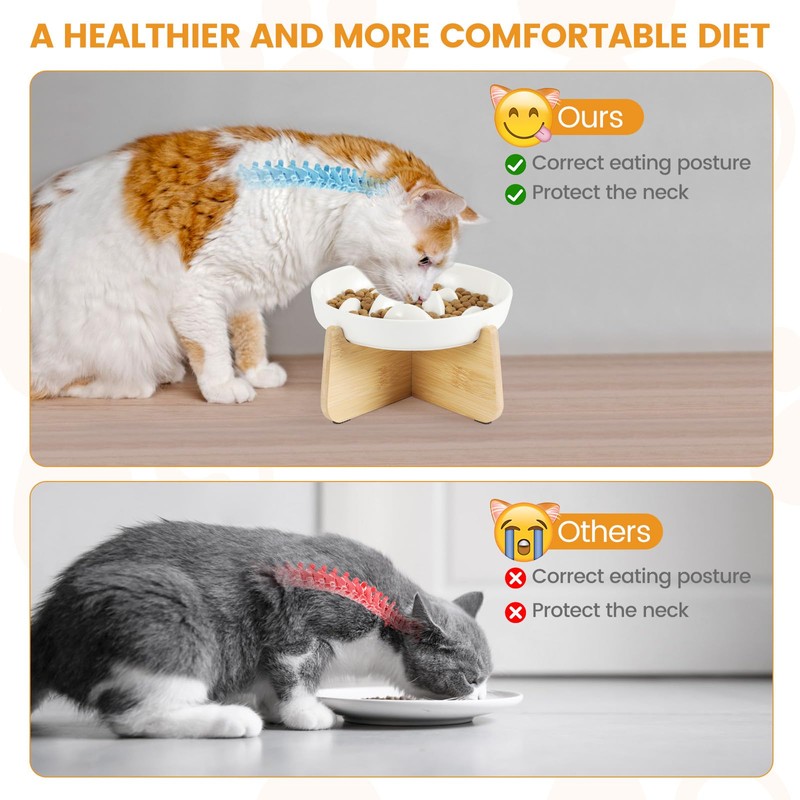 - Elevated Stand: With a non-slip stand that is 3 inches in height, the food can be placed at a more comfortable height for your cat. The raised slow feeder cat bowls allows for a natural feeding posture, alleviating pressure on the cat's neck and back, promoting digestion, and reducing food reflux caused by fast eating