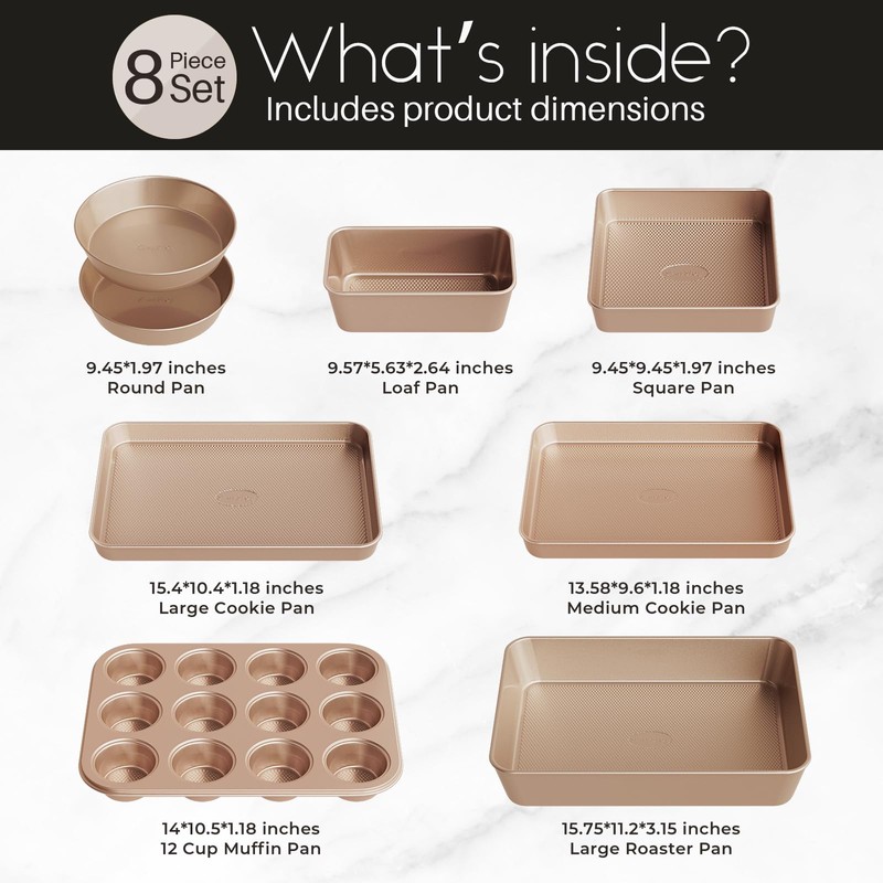 - 8-Piece Baking Sheet Pans: Slow Slog bakeware sets offers a complete collection of kitchen utensils, including 2-set cake pans, medium cookie pan, large cookie pan, 12 cup muffin pan, loaf pan, square pan, large roaster pan