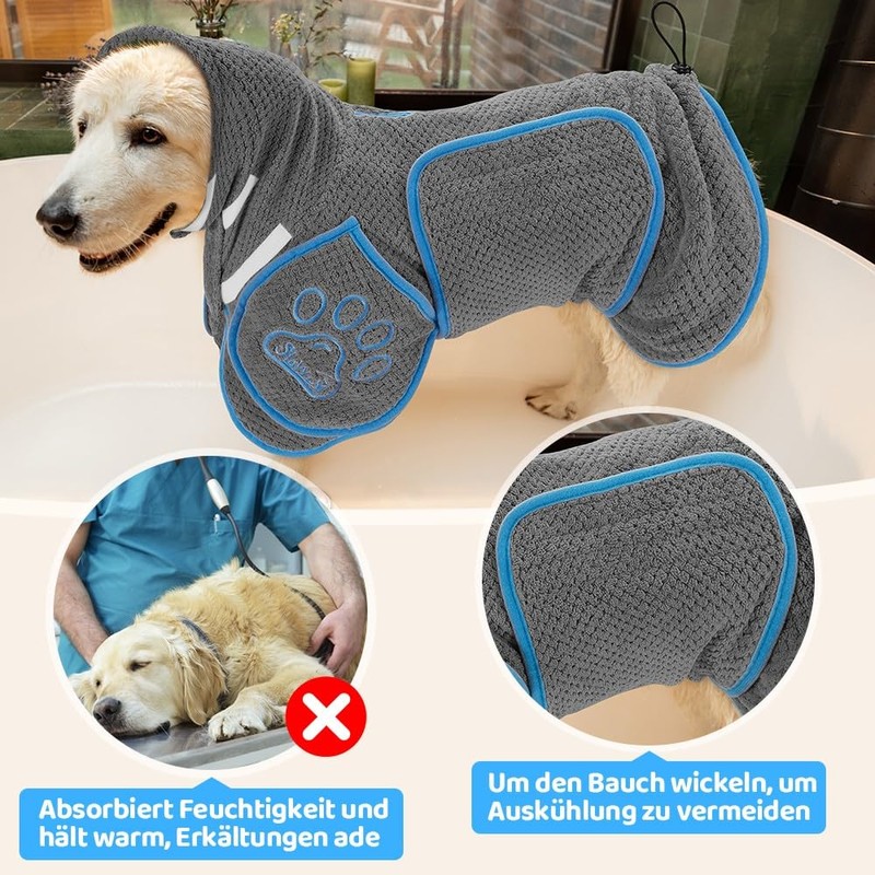 - Adjustable, individual fit: the bathrobe is equipped with a high collar with Velcro fastener that completely covers your dog's head without slipping, and which can be folded as needed, so that it does not slip off easily. The widened Velcro straps at the waist and drawstring on the tail allow for quick size adjustment for a comfortable and secure fit.