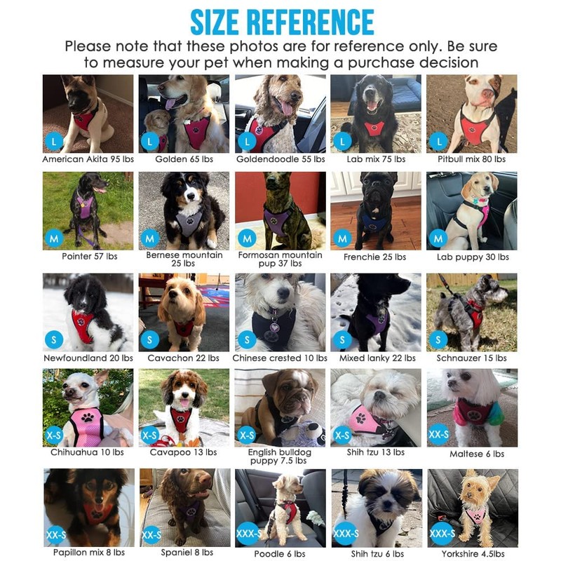 - EASY TO USE AND QUICK RELEASE --- There are two buckle on the chest part, which make the harness easy to put on and no need dogs to step in. And the four adjust buttons on the harness strap, can be easily adjusted to make your fur friend feel comfortable, and suitable for all small, medium and large size dogs, or even kitten cats and medium cats.