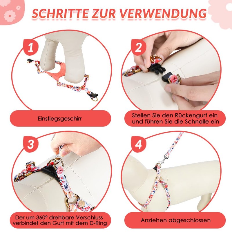 SlowTon Dog Harness with Lead, No-Pull Lightweight Soft Suede Puppy Harness with Floral Pattern and Snap Buckle, Adjustable Dog Harness for Small and Medium Dogs (Flowers, M)