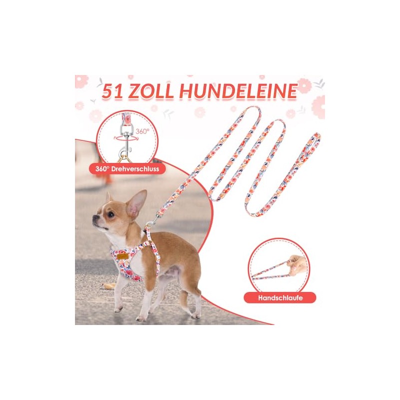 - Tangle-free leash: the puppy dog harness is equipped with a 1.3 m dog lead. The 360° rotating metal buckle is easy to hook and tangle-free. There is no need to buy an additional dog lead.