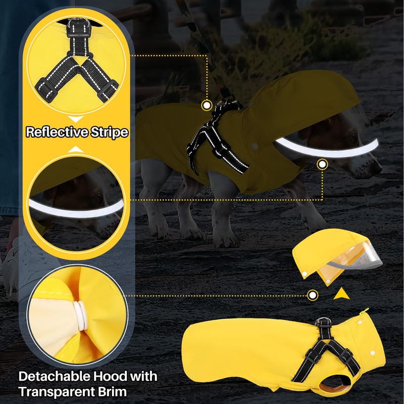 - Detachable Clear Hood with Reflective Safety --- The EVA transparent hood shields your dog’s eyes from rain without obstructing vision, while the reflective brim enhances visibility in low-light conditions. Easily attach or remove the hood via four snap buttons – ideal for adapting to changing weather.