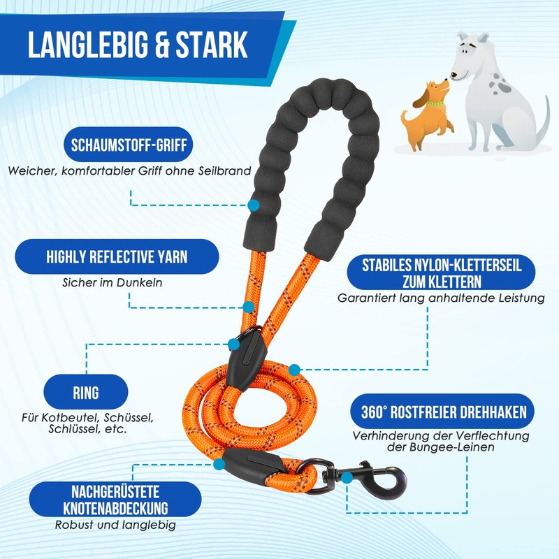 - Comfortable padded handles for better control --- Our medium/large dog lead comes with an additional handle on the respective leash, which allows better control when walking with your furry friends. The main rope features a soft padded foam handle to provide a very comfortable grip and protect your hand from rope burns during the walk.