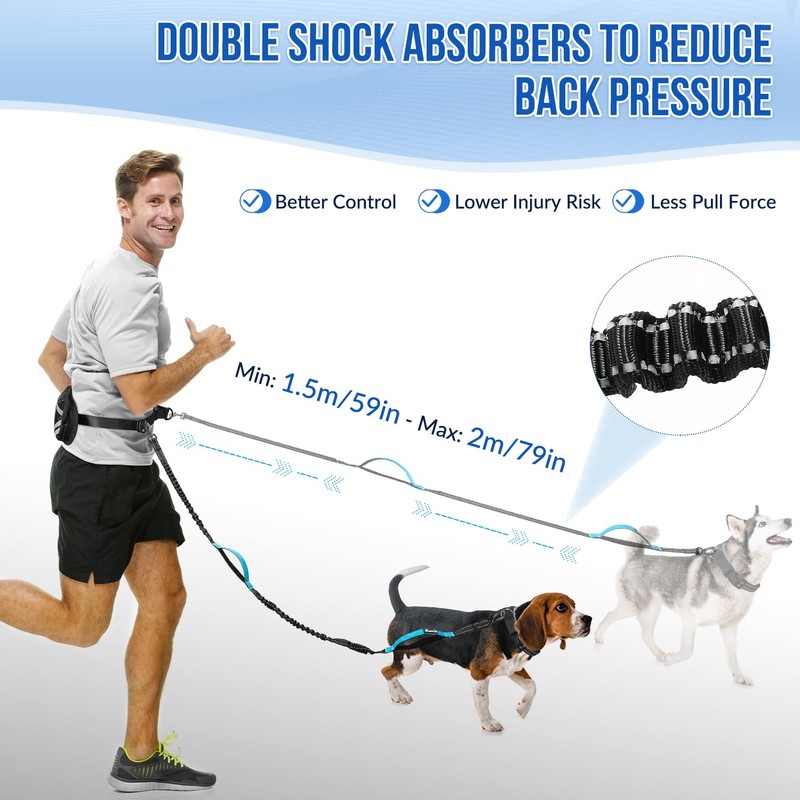 This sturdy belt is adjustable from 0.6 m/24 inch to 1.25 m/49 inch to fit a wide range of waist sizes. And minimum length of leash is 1.5 m/59 inch and maximum length is 2 m/79 inch, providing you more safeties while letting your dogs walk around you within greater range