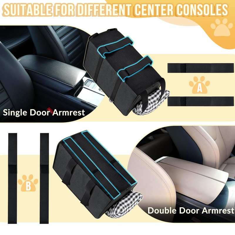 - Sliding Prevention --- This new version center console bag has two straps on left and right sides that can be attached to the driver's and passenger's seat headrests. The puppy console car seat prevents the bag from sliding during car rides and ensures your dog's safety. The end of straps have metal hooks for quick detachment and can also be used as shoulder straps when the bag is not in use