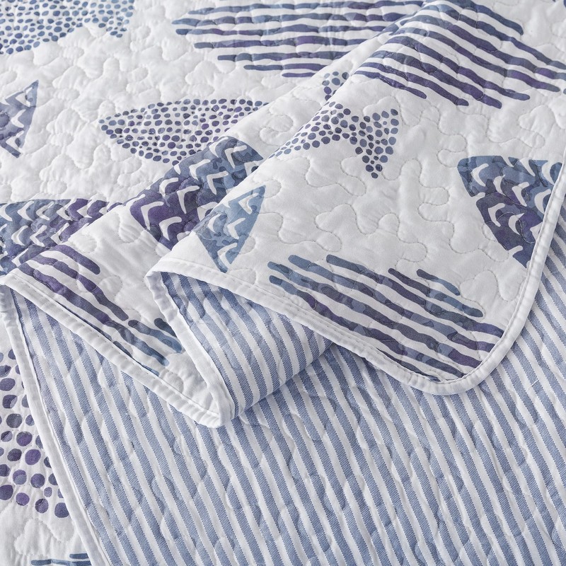Crafted with modern design sensibilities while embracing timeless comfort, the Sea of Dreams quilt set is your sanctuary after a long day. As you slip beneath its covers, you're enveloped in warmth and coziness, courtesy of the luxurious quilt that makes every night's sleep feel like a gentle drift across calm waters. The cheerful fish print ensures this quilt set stands out as the bright spot in your home décor, effortlessly blending with any style to keep the atmosphere light-hearted and inviting. The quilt reversibly features a subtle blue wave pattern, offering versatility in styling to match your mood or room's theme.