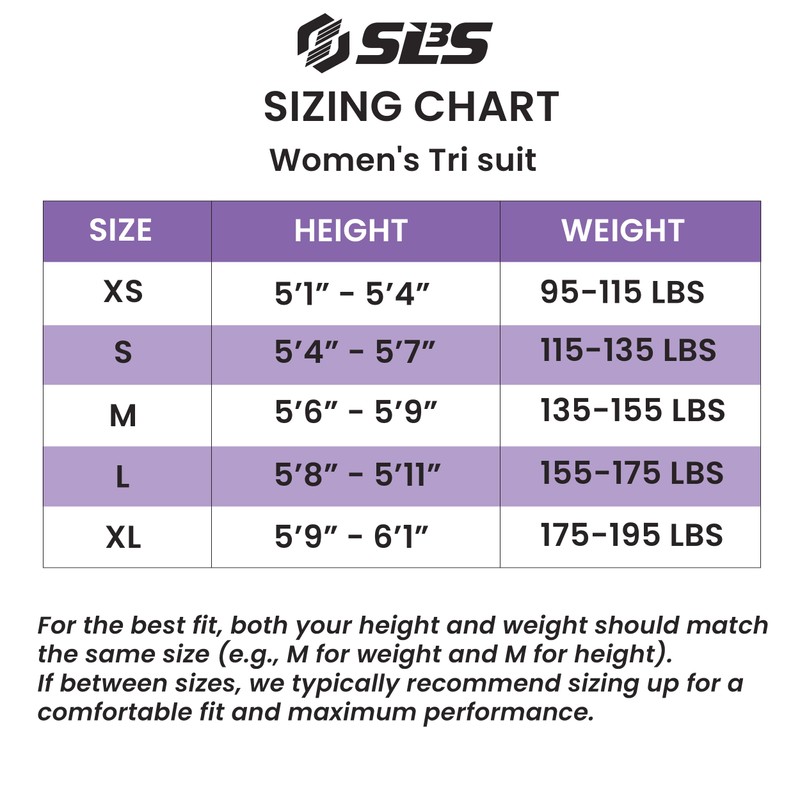 - SIZING INFORMATION: To properly fit into our triathlon suit women need to check the size chart in the images. Both height and weight measurements must match the specific size range (i.e. weight size M and height size M). THIS WOMENS TRI SUIT OFFERS A SLIM ATHLETIC FIT