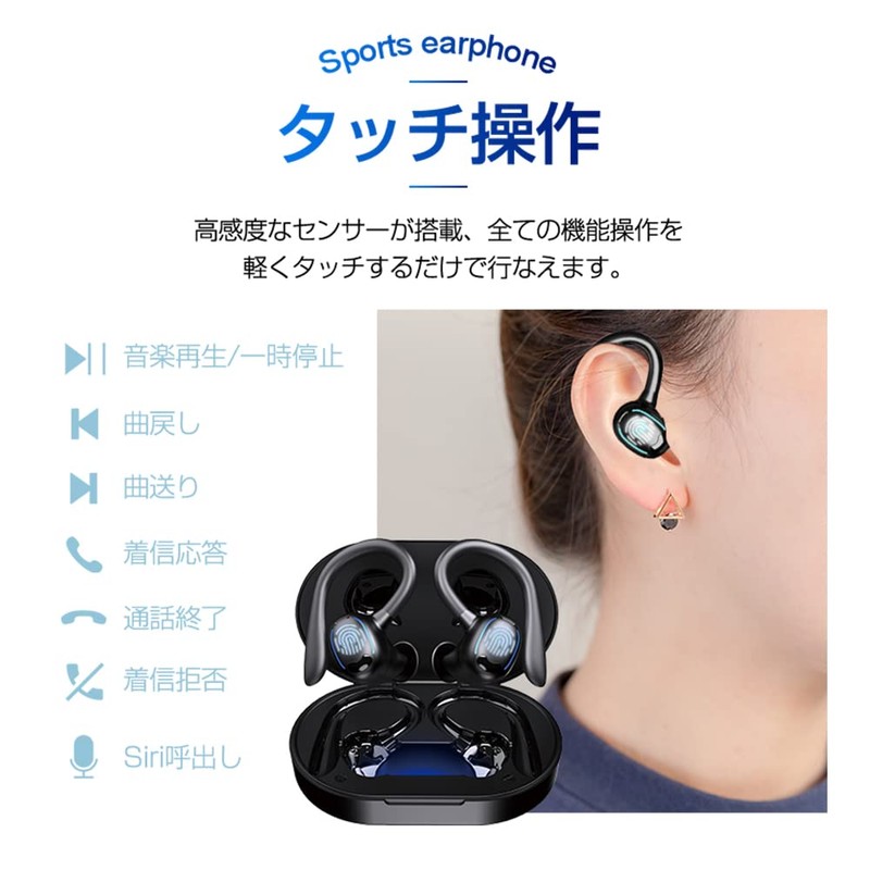 - (Over-the-Ear & Touch Control) These earphones are designed for sports by attaching the ear hooks to your ears. The fit of the earbud and the stability of the earphones is greatly improved. It is hard to fall off even during intense sports situations, so you can wear it comfortably for a long time. With a simple tap of the touch panel, you can easily achieve various functions, including music playback, pause, answer calls, reject calls, switch songs, and activate Siri