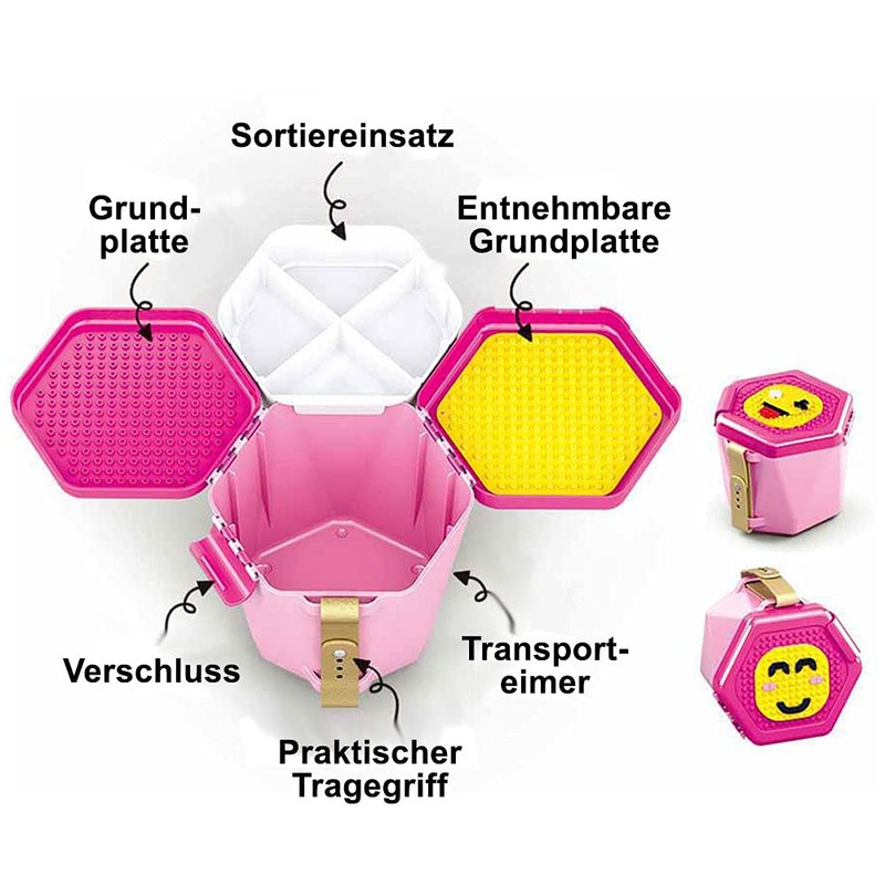 - As an aid in building, the play bucket consists of a three-piece, fold-out lid in which small base plates can be attached so that the built holds securely and nothing is lost