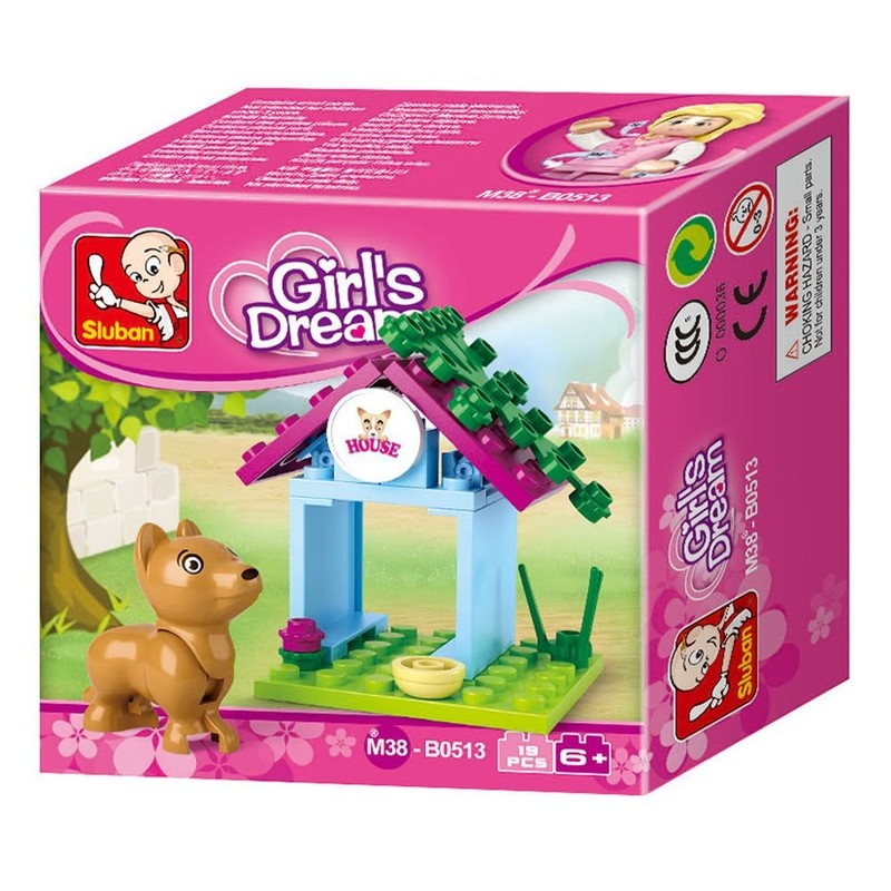 Any girl would like to have a dog as friendly and nice like yours. He is your best friend, he follows you everywhere and often saves you from trouble. Take care of him! Build him a nice and colored house where he can rest. Don't forget to feed and give him water daily. The little house is just his so you can put a board with his name on it. In the hot days he will be protected. The plant near the house will assure his shadow. The "Dog house" set is part of the Sluban Girls Dream collection and it contains 18 pieces. Add it to your Girls Dream collection and build a whole town!
