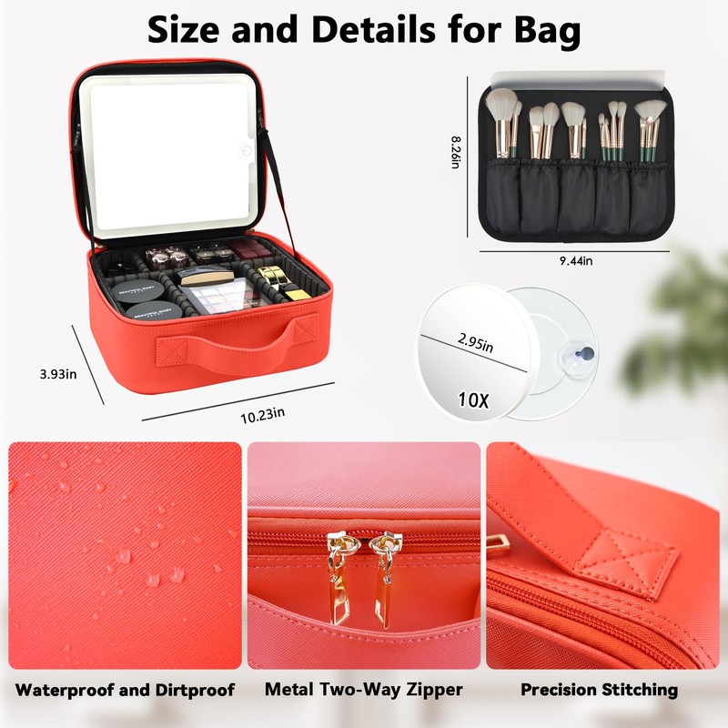 - 【Portable Dressing Table】The large capacity travel makeup bag with LED mirror size is 10.23*9.05*3.93 inch. It is made of high-quality PU leather, which is waterproof, easy to clean, durable and wear-resistant. The zipper system is made to a high standard to ensure smooth pulling.