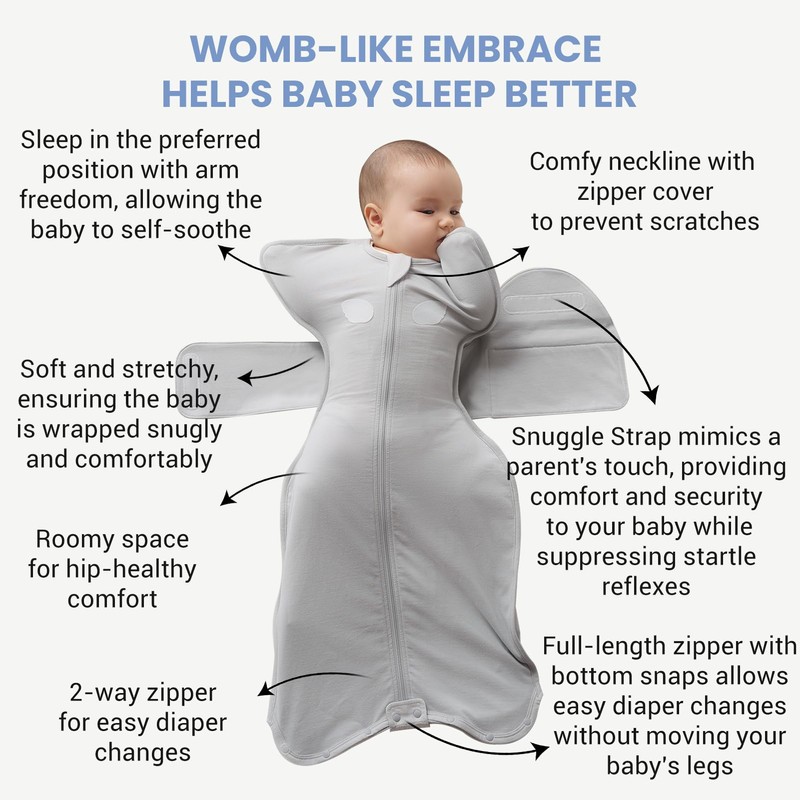 - WOMB-LIKE COMFORT FOR BETTER SLEEP: Our swaddle creates a womb-like embrace, offering your baby a secure, calming feeling. The Snuggle Strap wraps gently around your baby’s chest, mimicking a parent’s touch to reduce startle reflexes and prevent sudden wake-ups (without added weight). This design supports calm sleep, helping your baby fall asleep faster and stay asleep longer. A zipper cover at the neckline prevents scratches, ensuring a safe, cozy sleep environment.