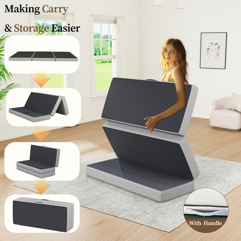 - 【Foldable Memory Foam Mattress】Made of CertiPUR-US Certified Foam and soft fabric, the 4 inch trifold mattress provides excellent body support and comfort feel. With tri-fold design, the full size mattress is more convenient to carry and store, perfect as sofa or cushions.