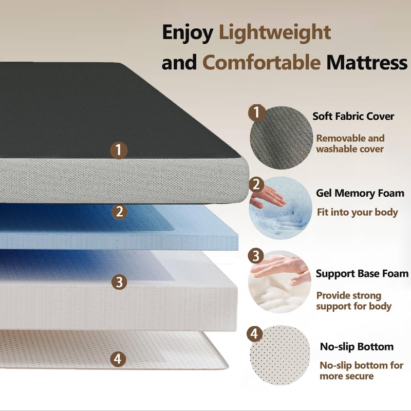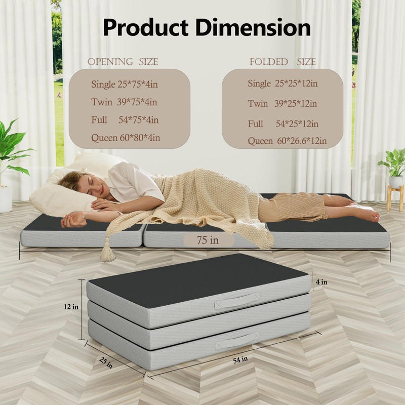 - 【Detachable Cover & Hidden Zipper】The 4inch foldable bed mattress features a removable, machine-washable cover, making maintain the tri-fold mattress is a breeze. Come with hidden zipper and non-slip bottom, our tri-fold mattress stays securely in place, providing you with a stable and safe sleeping surface.