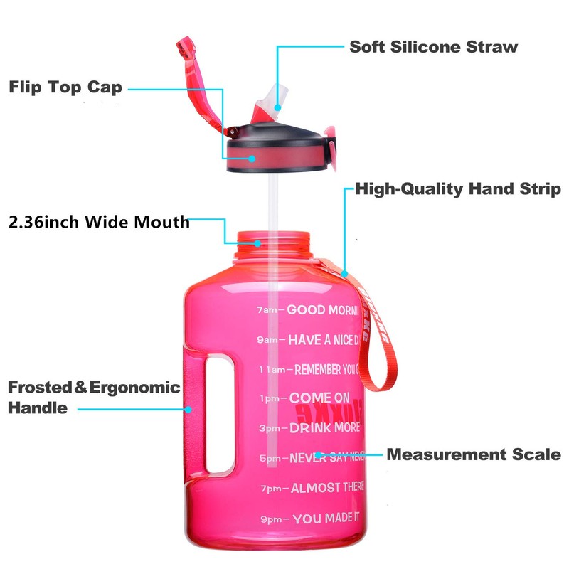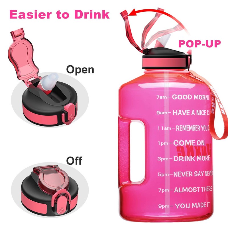 - WIDE MOUTH & SOFT SILICONE NOZZLE: Water is the source of life, the wide mouth of the 1 gallon sport bottle make it easy to add ice cube, lemon or other fruits in your water, no need to lift the water jug bottle, just one click pop-up, the comfortable silicone nozzle will inspire you want to drink more water with the encouraging quote reminders of the daily.