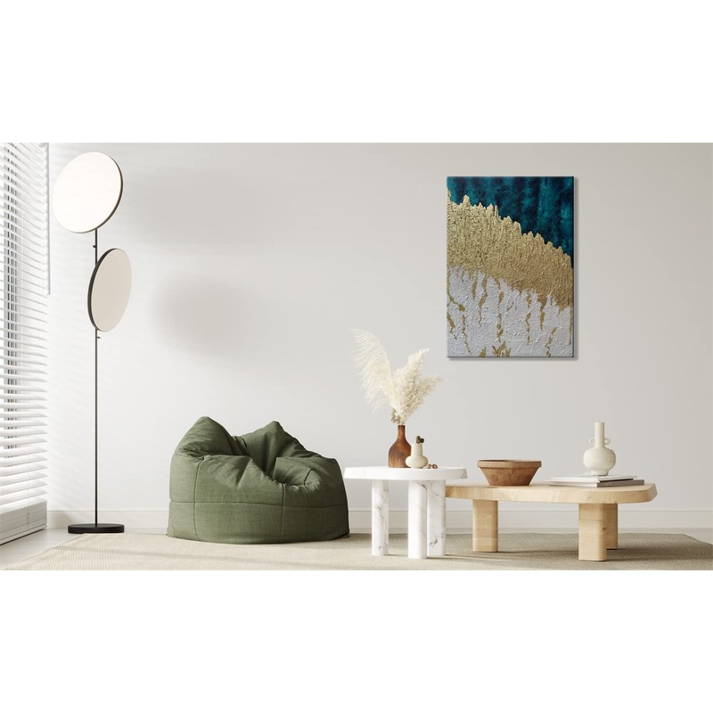 - High Quality: Gold foil painting on canvas, 100% hand-painted textured metal luster art. The painting is a combination of blue and dark green, with gold foil in the middle and white below. The whole painting has a thick texture and simple abstract pattern. It is a good choice whether hanging horizontally or vertically.