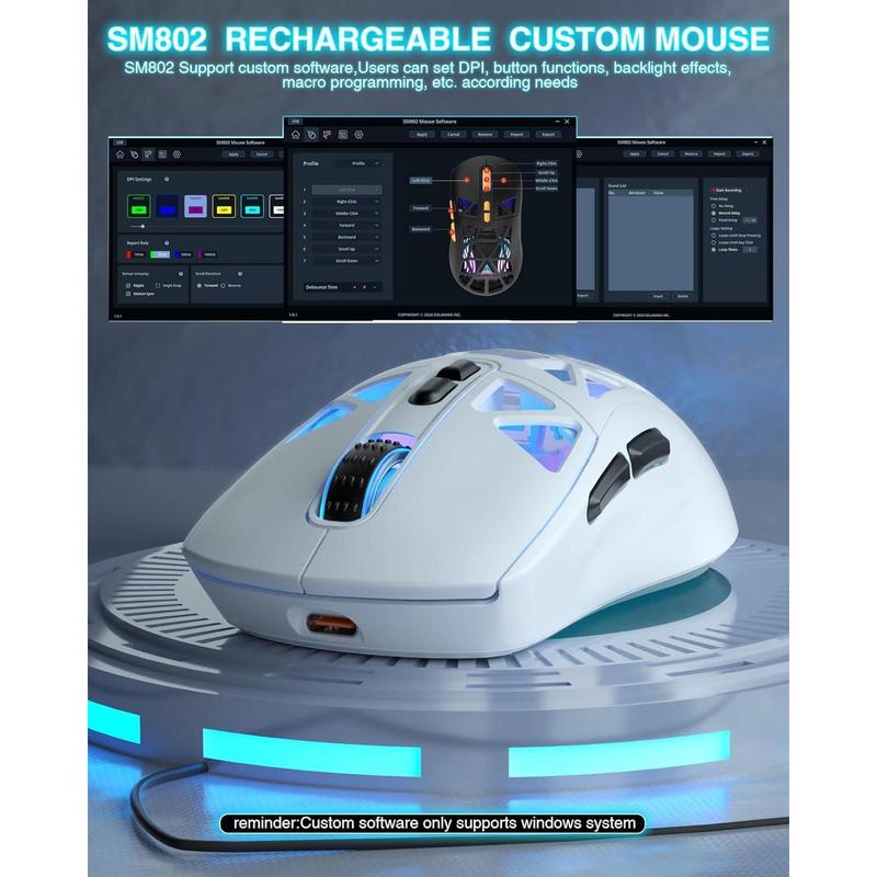 Custom and 7 Programmable Buttons: SM802 computer mouse supports software customization.Through the software users can reset the button functions, adjust DPI, configure macro files, etc.The custom software functions only supports Windows system and wired mode