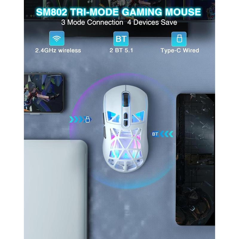 3 Mode Connectivity:SM802 gaming mouse supports 2.4G wireless, BT5.0 and wired 3 connection modes.It can be save 4 devices same time,fast response and smooth operation.NOTE!!Use the wireless function, please switch the mouse's signal source to the signal light corresponding and device,otherwise it will not be connected