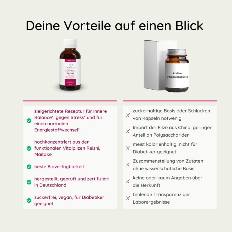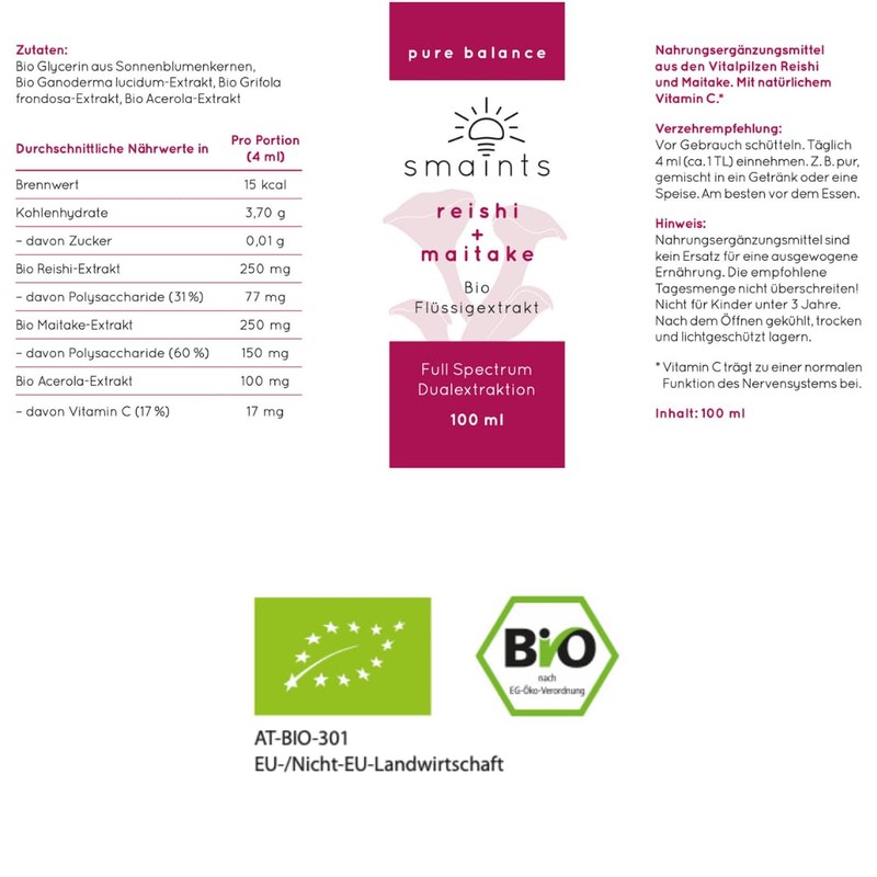 - Organic vital mushroom extract: smaints Pure Balance consists of maitake and reishi. The extra is not in capsules, but in liquid form. Dual Extract 100ml Bottle Alcohol Free