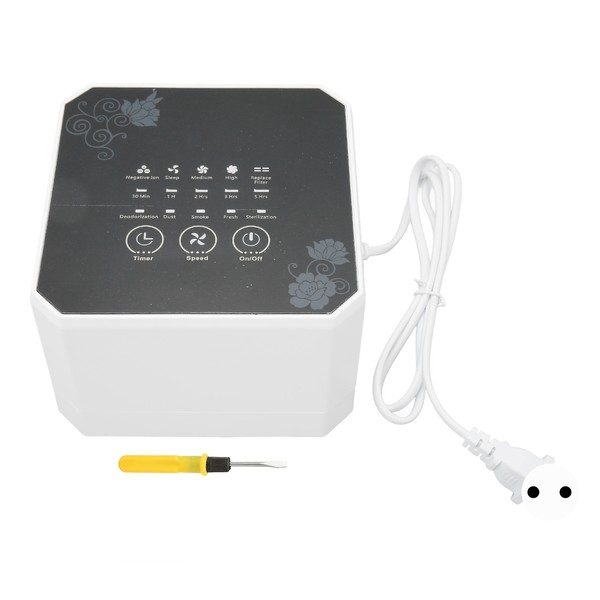 1、Highly Efficient: 3 stage High Efficiency Particulate Air filter with high efficiency activated carbon, built in negative ion generator, powerful enough to provide up to 80CFM purified air, effectively improve air quality. 2、Touch Control, Timer: This air purifier is touch screen button, easy to operate, with timer function, you can choose 30 minutes, 1 hour, 2 hours, 3 hours, 5 hours according to your needs. 3、Low Noise: The noise level of this air purifier is less than 30 decibels, which won't affect your work or study, and it won't even disturb you when you are sleeping, it's perfect for bedrooms, offices, small spaces and so on. 4、with High Efficiency Particulate Filter: The High Efficiency Particulate filter captures particles in the air, including pet dander, dust, pollen, odor etc. Effectively improving indoor air quality. 5、Lightweight and Portable: The mini purifier is small and lightweight, and you can carry it everywhere.