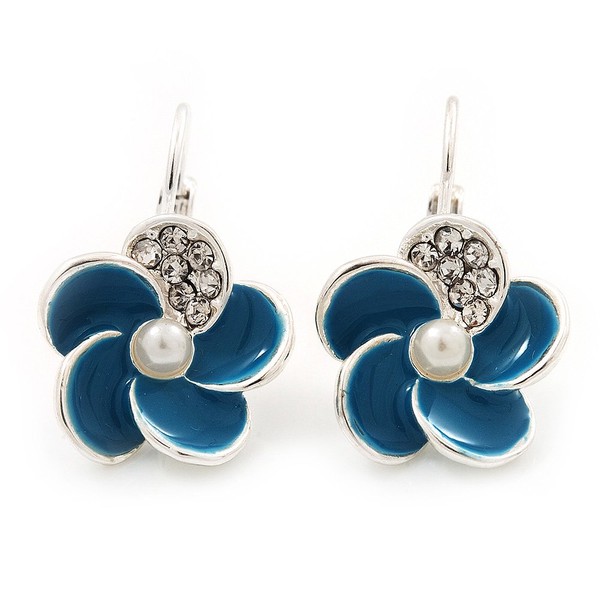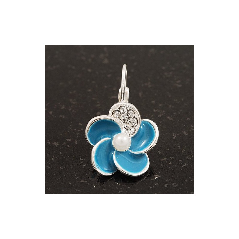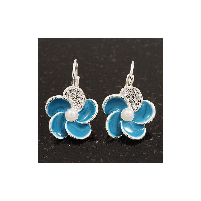 Small Blue Enamel Diamante Flower Drop Earrings In Silver Tone/ 25mm Long